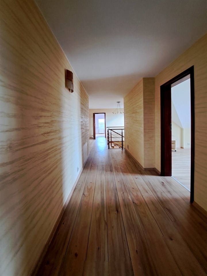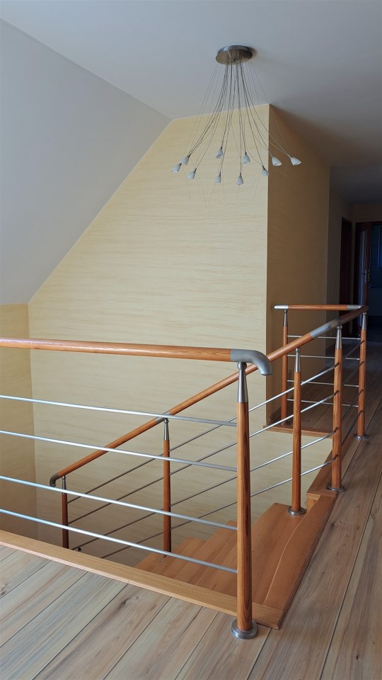 Kierując się schodami w górę znajdujemy się w holu kolejnej kondygnacji. Na piętrze znajdują się 4 pokoje, 2 garderoby, w tym jedną przynależną bezpośrednio do sypialni, 2 łazienki (z czego jedno z pomieszczeń stanowi pokój kąpielowy).