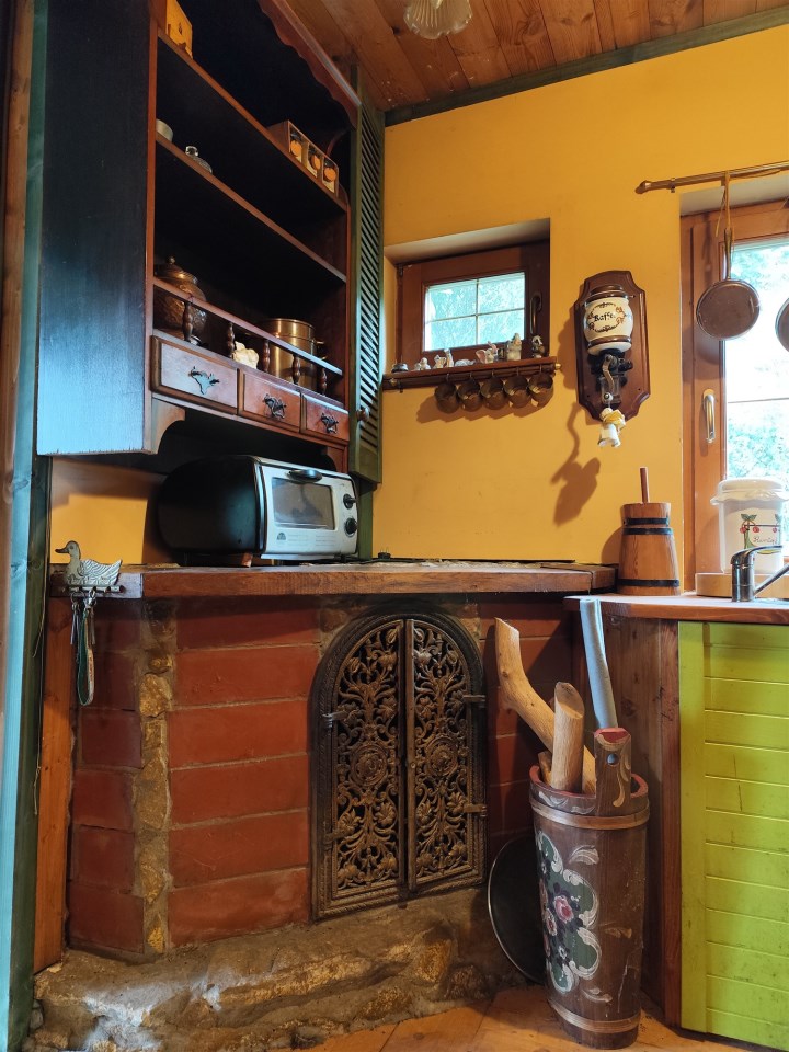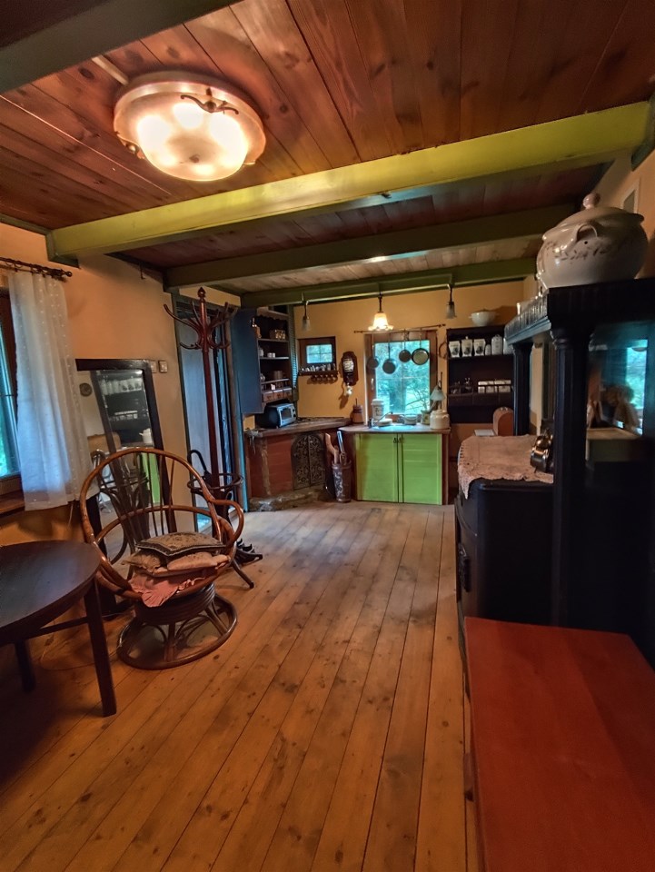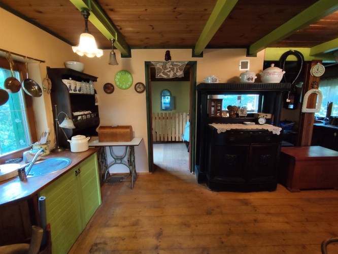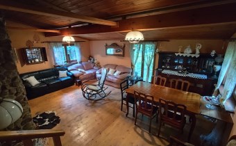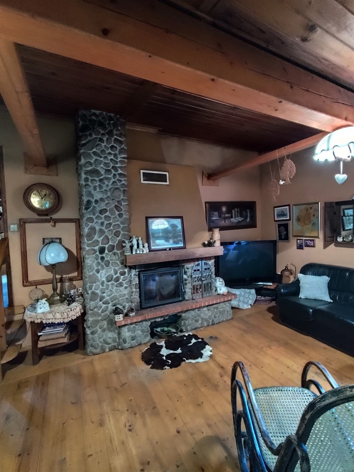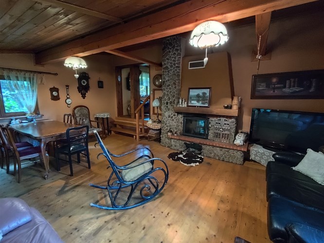 Dom posiada przestronny, klimatyczny salon z kominkiem, którego kamienna obudowa nadaje wnętrzu przytulny, góralsko-letniskowy charakter. Drewniane sufity i podłogi tworzą wyjątkowy nastrój, a liczne okna zapewniają naturalne oświetlenie oraz widok na otaczającą zieleń.