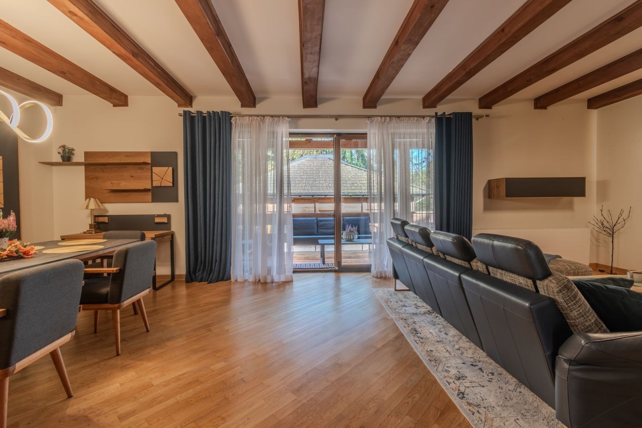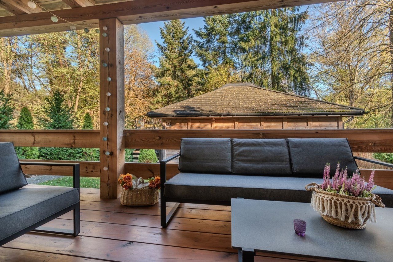Z dwóch sypialni wychodzi się na przestronny, zadaszony taras.