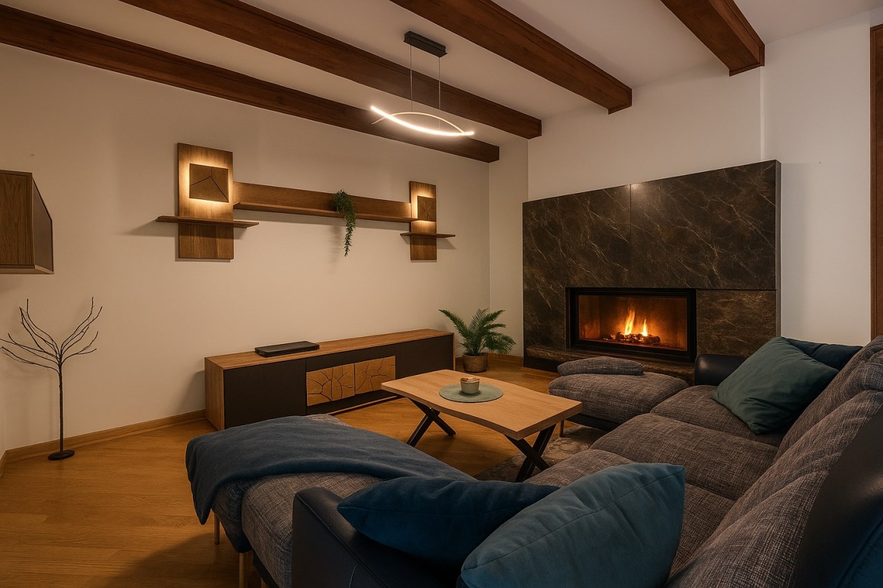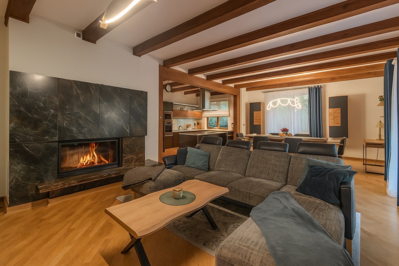 W salonie znajduje się zamknięty kominek z rozprowadzeniem ciepła na poddasze.