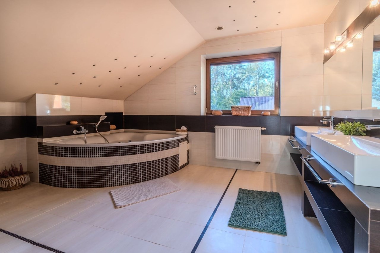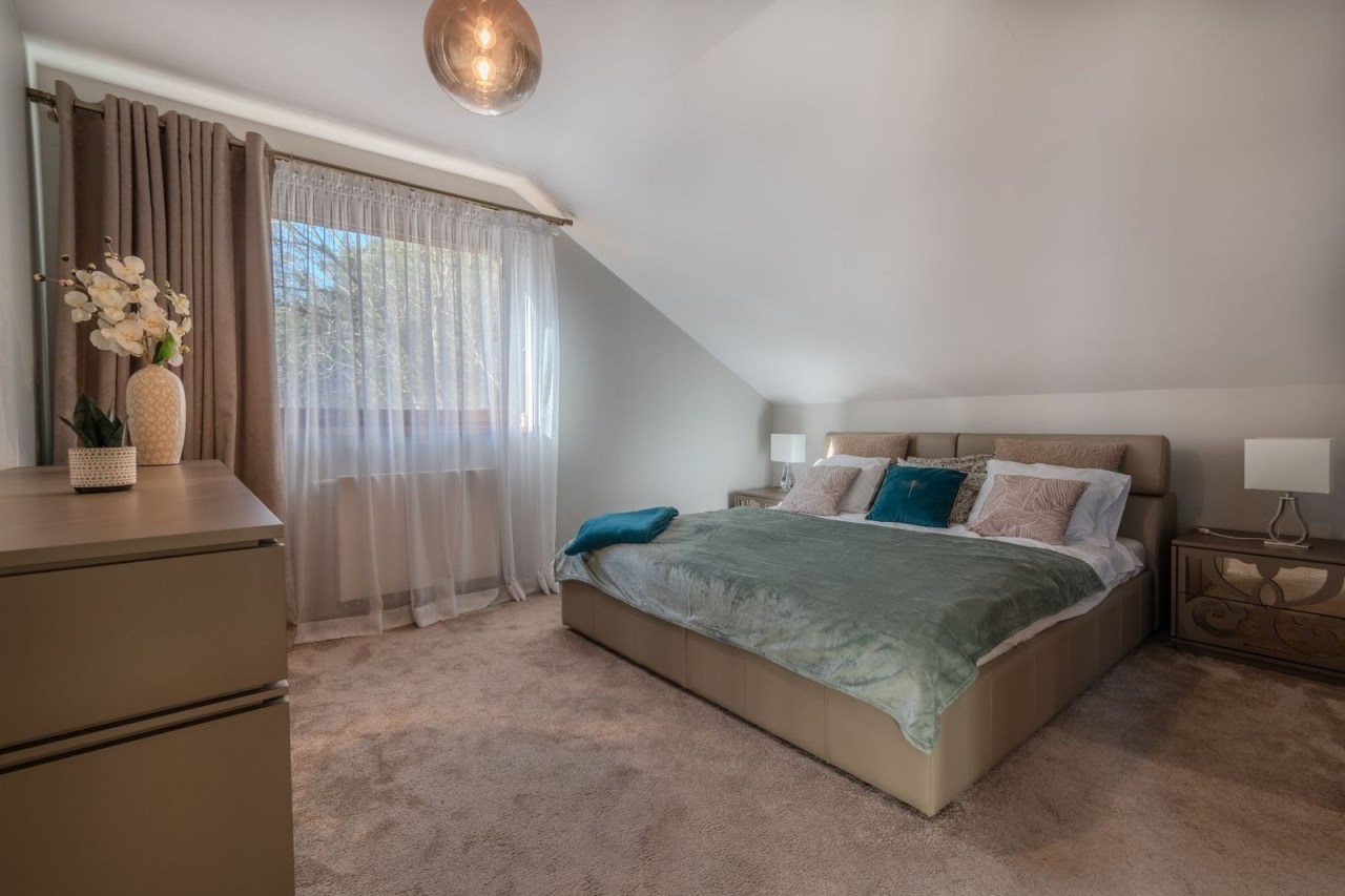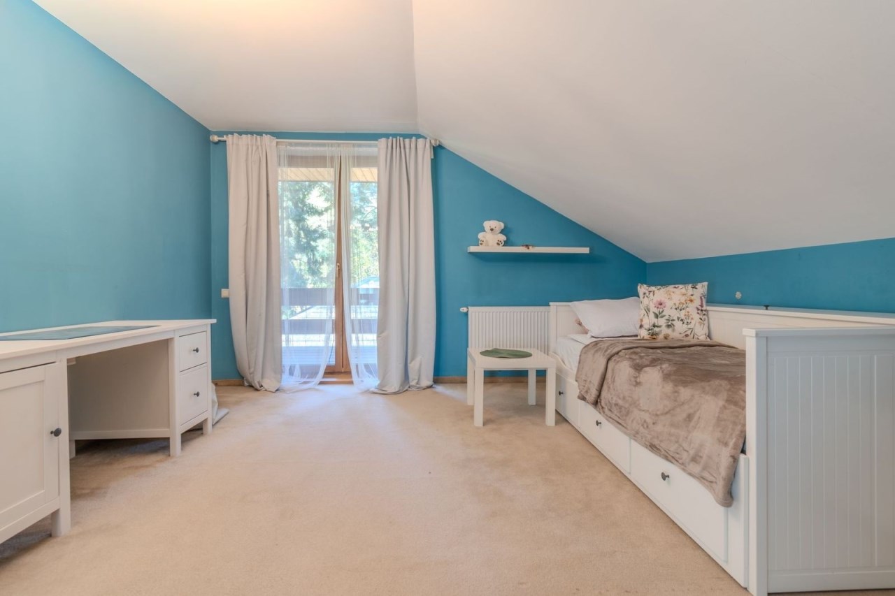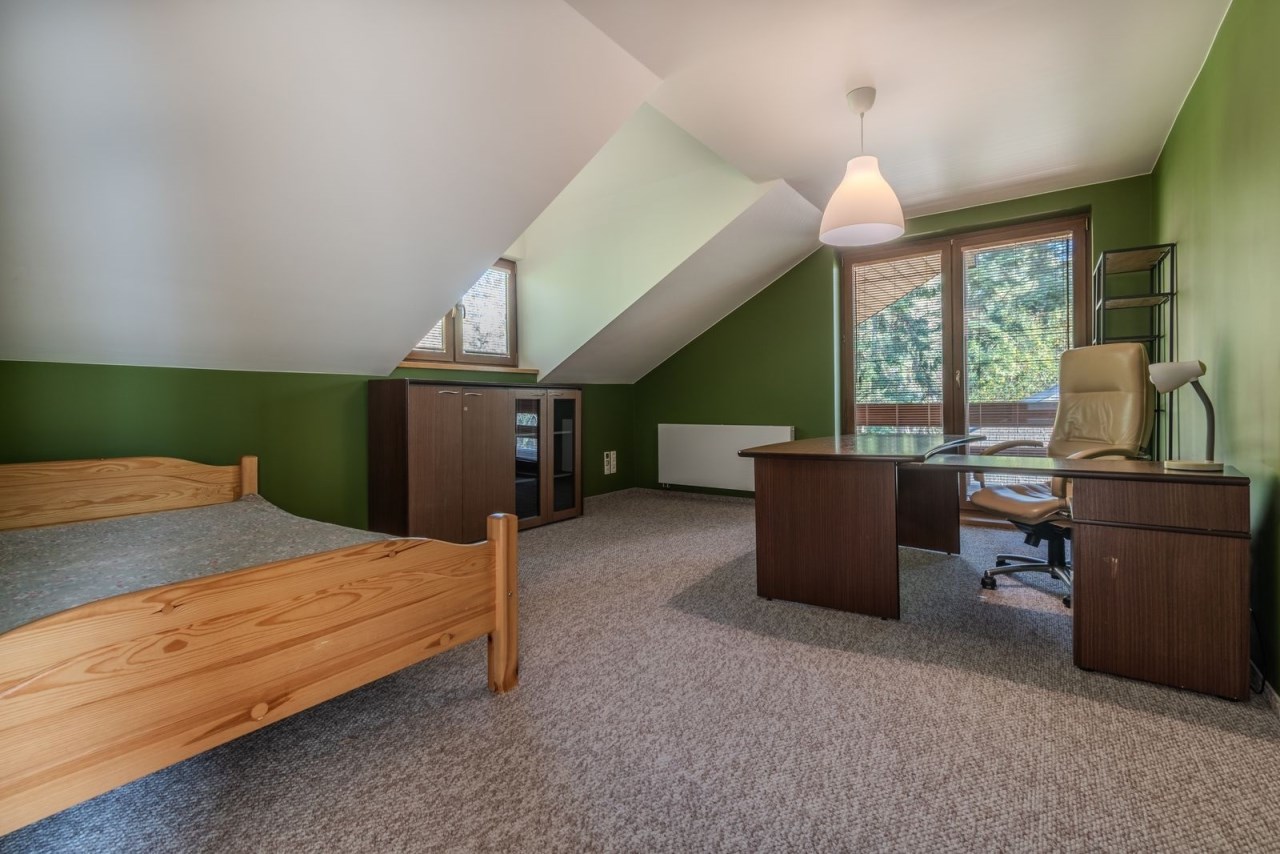 Poddasze użytkowe: trzy obszerne sypialnie, jedna z nich z garderobą, pokój kąpielowy z dużą wanną, bidetem, dwoma umywalkami i sedesem.
