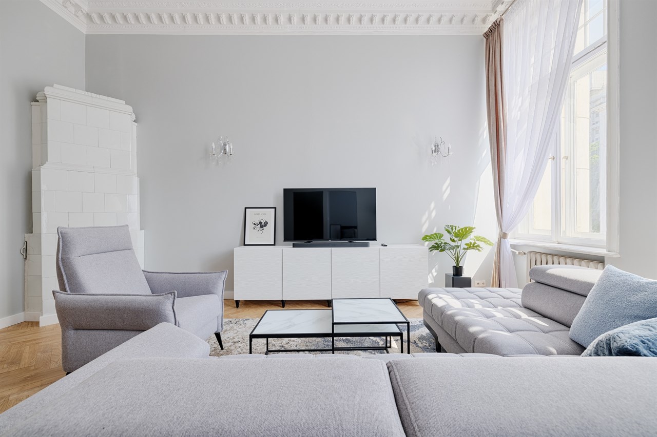 W mieszkaniu są oryginalne sztukaterie i unikatowy piec kaflowy.